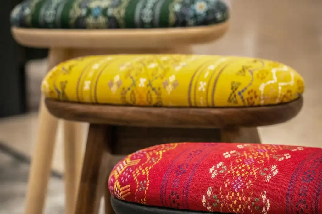 弊社は、福岡県の家具メーカー・ナガノインテリアと共同で、沖縄の伝統織物を用いた特注スツールを開発しました。